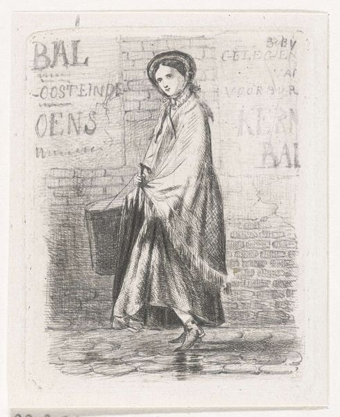 This print, "Vrouw met hoedendoos," or "Woman with Hat Box," was made by Philippus Anthonius Alexander Kanne using etching, a printmaking technique that involves biting lines into a metal plate with acid. Look closely, and you’ll see that the network of fine lines defines the woman's form, her clothing, and the hat box she carries. The etching process gives the image a soft, slightly grainy texture, a direct result of the corrosive action of the acid on the metal. This was not a mass production, but it allowed for relatively quick creation of images, compared to laborious engraving processes. Consider the social context here. Printmaking in the 19th century was a way to disseminate images widely, and prints like this one offer a glimpse into everyday life of the time. The woman's simple attire and the utilitarian hat box suggest a working-class subject, rather than someone from the affluent classes. The beauty of this lies not just in its aesthetic appeal, but also in its ability to connect us to the past. This print reminds us that art is always intertwined with materials, labor, and the social realities of its time.