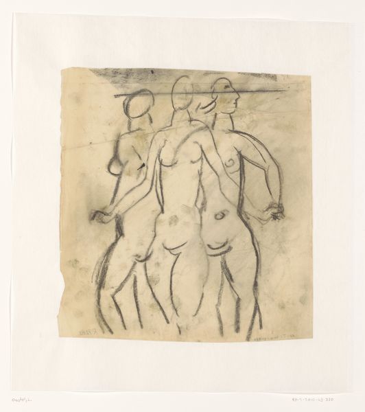 Leo Gestel made this drawing of three standing nudes with ink on paper, but exactly when is something of a mystery. Gestel’s loose application of ink in this work feels immediate and exploratory, like he’s thinking through seeing. The grid is visible, which tells us something about his process; it suggests a mechanical approach, perhaps scaling up from a smaller sketch, or working to a set of proportions. The contrast between the grid and the fluidity of the drawing is interesting, like a tension between freedom and control. Look at the confident line that describes the hip of the figure on the left; it's economical, almost cartoonish, yet somehow also sensual and full of life. The composition brings Picasso to mind, particularly the way he distorted and fragmented figures. But where Picasso is often aggressive and angular, Gestel is softer, more lyrical. Ultimately, art's a conversation, and Gestel seems to be in dialogue with modernism while speaking in his own unique voice.