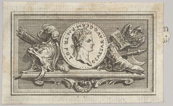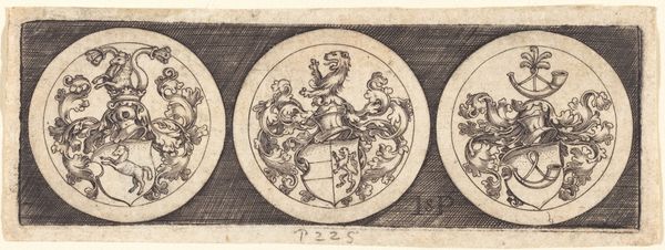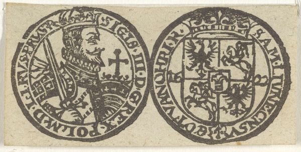 Curator: Hmm, striking! It looks like an ancient proclamation rendered in miniature... Editor: Indeed. What we have here is a 1625 engraving, titled "Penning met portret van Sigismund III, koning van Polen en Zweden," or a medal portraying Sigismund III, King of Poland and Sweden. Curator: Sigismund. That guy looks severe! All rigid lines, especially that high collar. Like wearing a stony fence around his neck. But also… regal, I suppose, the crown does most of the talking. It has this sort of confident directness about it. It kind of reminds me of trying to act tough when I was little. Editor: Absolutely, the high collar was high fashion and high status at that time. Now, beyond portraiture, it’s valuable as an artifact illustrating 17th-century iconography and royal representation. Notice how meticulously rendered the coat-of-arms on the flip side are—each heraldic symbol has encoded stories within it. A testament to symbolic systems of the period. The work itself demonstrates the linearity and detail afforded by engraving as a printing medium, too. Curator: Linear is the word. It's all about lines here. Thick, thin, close, far... the magic's in the density, isn't it? This little medallion tries to scream power but almost ends up looking insecure. I keep seeing the king's vulnerability... and the weight of what he represents... but, maybe that's just me? Editor: Perhaps! Yet it’s a dance between symbolism and subject. It seems to me to communicate that despite their station or era, those figures that led empires were people marked and defined by their moment, in the same ways we all are. Curator: What an unexpectedly human moment.