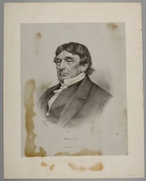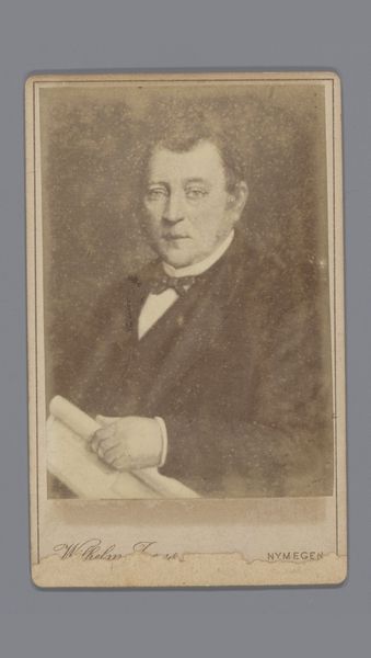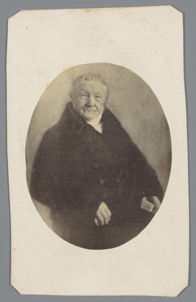Editor: Here we have a gelatin silver print, a portrait of an unknown man, dating somewhere between 1859 and 1873, attributed to Joseph Dupont. What strikes me is the sitter's unwavering gaze, almost confrontational. What do you make of this work, focusing on its formal elements? Curator: Indeed, let's consider the composition. Note the oval frame within the rectangular card. This immediately creates a contained space, focusing our attention on the subject. What is the effect of that frame, do you think? Editor: It feels like he is being observed, almost pinned, as in an entomological study. The curve is softened by the dark tones and the straight edges. It makes for a somewhat serious yet softer image overall. Curator: Precisely. Now observe the tonal range, from the stark white of his shirt to the deep blacks of his coat. This dramatic contrast shapes the figure. The soft, almost diffused light across his face emphasizes the texture of the skin. Notice also the balance – or perhaps the slight imbalance – in the placement of the head within the oval. Is he truly centered? What are your thoughts about the lines that define the composition? Editor: I can see the soft curvature contrasting to the strong straight edges. Although at first look it feels that everything is symmetrically aligned, I can tell he is slightly positioned on the right. I had to make an effort to analyze them separately. Curator: Precisely. That tension, between symmetry and asymmetry, creates a visual dynamism. This play between light and dark, line and curve, engages the viewer in a prolonged act of seeing. Formally speaking, Dupont masterfully employed photographic techniques to deliver a realistic depiction that transcends mere documentation. I appreciate that your attention to the details contributes to our understanding of the photo's strengths. Editor: Thank you, seeing it this way really helps me see the overall meaning of its composition and form, not just the representation of the subject.