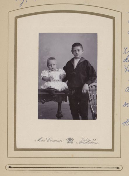 Willem Hendrik Dikkenberg made this portrait of two unknown boys, probably in his studio in Haarlem, using photographic methods that were common at the time. The sepia tones give the image a timeless quality, like a memory fading at the edges. Look at the way the light softens the boys' faces, almost blurring the line between the figures and the background. The surface of the print is smooth, with just a hint of texture that adds to its antique charm. The edges of the card are slightly worn, a testament to the passage of time and the many hands that may have held it. This reminds me of some of Gerhard Richter's blurred portraits. Both artists use a kind of soft focus to create a sense of distance and mystery. In the end, art isn't about capturing a perfect likeness, but about inviting us to reflect on the nature of memory and representation itself.
