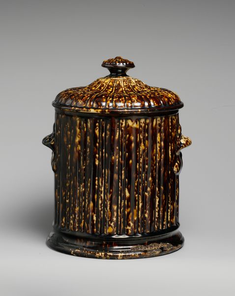 Editor: Here we have a ceramic flask made to resemble a book, crafted between 1850 and 1858 by the United States Pottery Company. The brown and gold mottled glaze gives it an antique look. What makes this piece so special? Curator: What intrigues me most is how this earthenware flask collapses the distinction between function and representation, high art and mass production. Notice the mimicking of bookbinding techniques in a commonplace drinking vessel, made possible by industrialization. It makes us consider how easily cultural symbols like the book, once associated with privilege, become commodities through these new means of production. Editor: So, you're saying it’s not just a quirky container but also a statement about industrialization affecting art and cultural values? Curator: Precisely. Consider the skilled labor required to create these forms on a larger scale. What impact might the material process have had on notions of craft, particularly in the context of 19th century America where industrial output increased, challenging traditions? Editor: It's fascinating how the materiality of this flask, the type of clay and glaze, connects to broader economic and social issues of the time. I hadn't thought of it in that way before. Curator: Exactly! The specific type of earthenware used tells us about accessibility, production costs and distribution, doesn't it? These are questions a materialist perspective raises that can profoundly shape how we interpret it. Editor: I'll definitely be paying more attention to materials and processes going forward. It adds another dimension to understanding art. Curator: Indeed. Focusing on materials gives objects voices, whispering tales of production and consumption across historical periods.