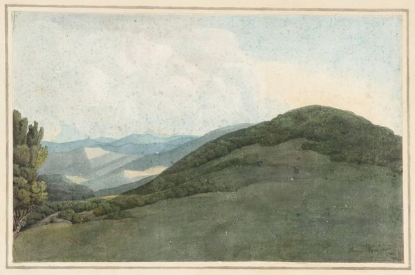Curator: Francis Towne created this watercolor, Monte Cavo, I, while touring Italy in the late 18th century. It's currently held in the Tate Collections. Editor: The scene feels both serene and vast, almost mythical with those distant blue ridges. There's a remarkable tranquility here. Curator: Towne's watercolors gained attention for their simplified forms and emphasis on line. This approach challenges the picturesque aesthetic popular at the time. Editor: Precisely! The mountain itself becomes a symbol of groundedness, perhaps of the classical past as a source of inspiration. The tree on the left feels like a guardian. Curator: Towne's depictions of Italy served a market increasingly interested in Grand Tour imagery, yet he distinguished himself from many artists by imbuing his landscapes with a unique, almost austere quality. Editor: The layering of the hills evokes a timelessness, a sense of history etched into the very landscape. It reminds us of the stories that landscapes hold. Curator: I find it interesting how Towne navigates artistic trends while subtly engaging with a growing interest in landscape as a reflection of national and personal identity. Editor: Ultimately, this work presents a harmonious balance of nature and symbolism, inviting us to reflect on our relationship with both. Curator: Indeed, this piece demonstrates the power of landscape to evoke a sense of place while sparking individual contemplation.