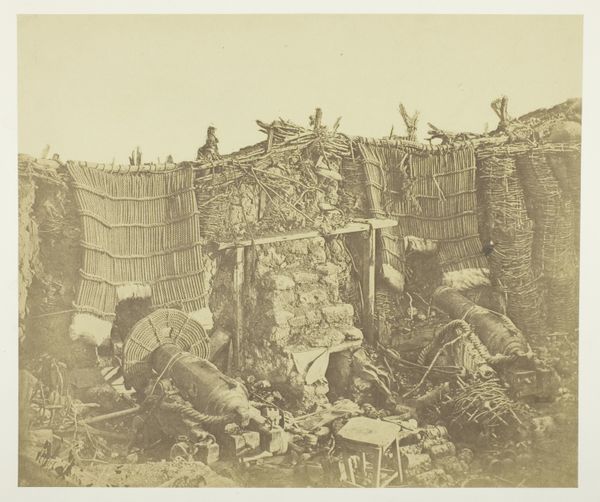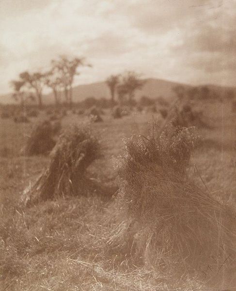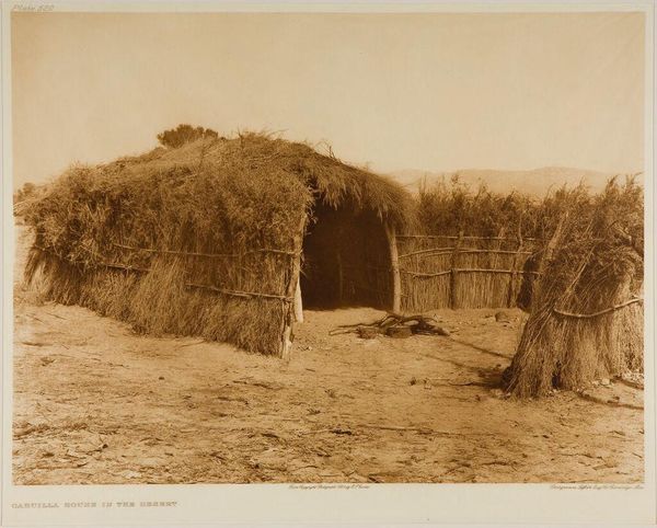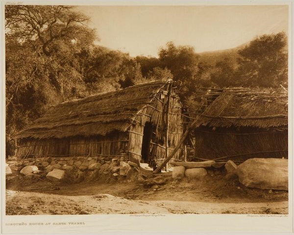 Curator: Here we see "A Mono Home," a photogravure by Edward Sheriff Curtis. I'm struck by the stark contrast between the rough texture of the dwelling and the looming, silent mountains. Editor: The scene feels so staged, doesn't it? Like a diorama frozen in time, stripped of its original context. Curator: Curtis saw himself as documenting a vanishing way of life. The home itself becomes a symbol – a signifier of tradition. Editor: But whose tradition? Curtis's lens inevitably shapes the narrative. We need to ask whose voices are missing from this "documentation." Curator: It is true that Curtis’s vision was filtered through his own cultural biases. Yet, the image preserves a physical space and its associated objects. Editor: Preserves, perhaps, but also idealizes and perhaps romanticizes. It is not enough to record, we must also analyze power. Curator: It’s a poignant reminder that even images meant to preserve the past are shaped by the present. Editor: Absolutely. By unpacking these layers, we can begin a more honest conversation about representation and cultural memory.