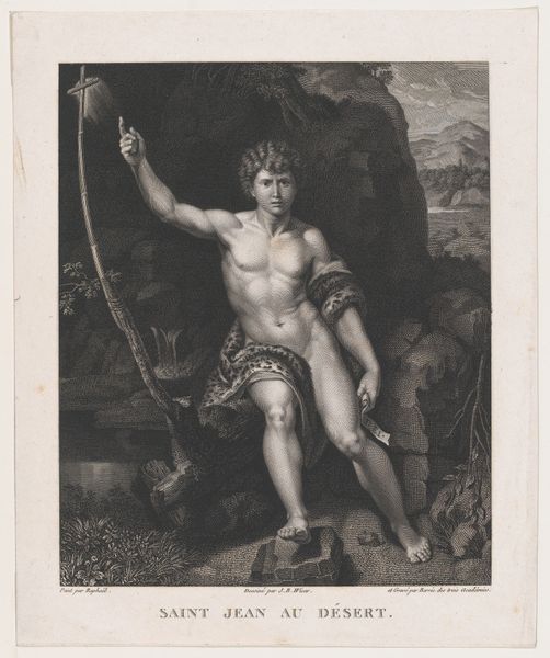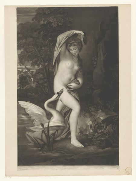 Curator: Ah, the ephemeral Zephyr. Prud'hon created this around 1864, a beautiful engraving capturing the essence of the West Wind himself, as he dips a toe in a cool pond. It’s currently held here at the Met. Editor: Well, isn't that dreamy? There's a definite wistful melancholy about it all. Like he's pausing, contemplating something before flight. Is that charcoal dust I see? I find its smokiness enhances the fairy tale like feel, adding a layer of something ancient. Curator: Prud'hon worked extensively in charcoal, so it probably influenced the feel even in the final engraving, absolutely. In many ways, Zephyr is tied to themes common in Prud'hon's time like male beauty, a historical inflection point and romantic idealization. And in the artistic choices you pick up the nuances: light and shadow are employed to enhance the almost palpable softness of Zephyr's figure, but beyond mere technique it becomes rather...suggestive. Editor: Right. Beyond just suggesting a Greco-Roman theme. There is symbolism there for me: look at Zephyr as he dangles those grapes...is he offering them? Is it for nourishment? Is he tempting someone? It strikes me more like Narcissus pausing to catch sight of his own beauty mirrored back at him from the pool, but with a sensual Baroque vibe. Curator: Interesting! He often played with subtle shifts of gaze and gesture in his compositions, so the effect could be deliberate, intended to create exactly the ambiguity you're describing! A delicious ambiguity! After all, the grape represents life’s pleasure, temptation…maybe Zephyr IS aware he is quite the vision, which gives an interesting twist, adding another layer to the historical romanticized narrative, wouldn’t you say? Editor: Precisely! It isn’t simply an artistic snapshot. He gives an old, old idea, the zephyr of Greek mythology and antiquity, a new identity as a figure suspended in time, light, and feeling. What do you suppose the future will see when looking back on Prud’hon and the symbolism represented in his ‘Zephyr?' Curator: Ah, only time will tell, won’t it? I know one thing—I see an embrace of subtle drama, rendered so delicately! Thank you for this insightful, very spirited perspective. Editor: The pleasure was all mine. Another delightful dialogue that shows us once again art isn't always about answers, but rather how we embrace the question!