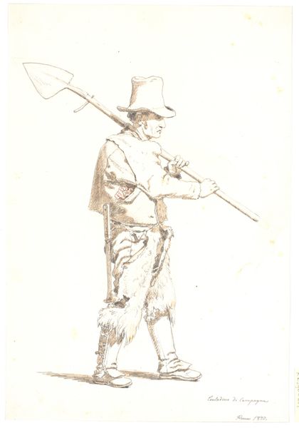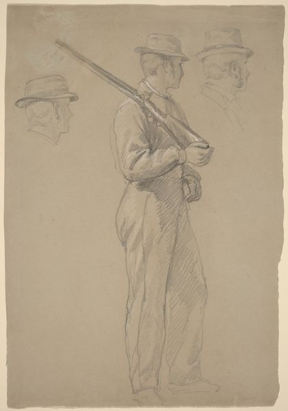 Editor: This is Rudolf Gudden’s pencil drawing, “Ein Arbeiter aus der _Großen Spinnerei von Edam_," dating back to around 1894. I’m immediately struck by the sense of quiet dignity in this working man's stance. What stands out to you? Curator: You know, it feels like a secret whispered on paper, doesn’t it? Look closely at the way the light dances – or perhaps more accurately, *hints* at dancing – across his clothing. He is caught in mid-motion. I wonder if he paused for the artist, or if Gudden snatched him unawares from the factory floor. Doesn't the soft shading almost elevate the mundane, the everyday life of a factory worker? Editor: It does, like he's been lifted out of time somehow. I mean, I see realism here, but also…something more. What do you think the artist was trying to communicate? Curator: I think Gudden was drawn, perhaps spellbound, by the intrinsic worth, even grace, he saw in honest labor. Those wooden clogs grounding him. The way his hands are active, even at rest, cradling his tools like they are sacred objects. But, you see that the scene cuts off, yes? We’re left with him and the work to be done – an isolating compression perhaps – the life outside, unknown, unconsidered in this sketch, isn’t it? Editor: So, it's more than just a simple study of a worker? It’s also an intimate observation, filled with empathy? Curator: Precisely! The piece is saying that dignity blooms even amidst the machinery. The artist seems to want to stop the grind, the hum, to capture the humanity that existed inside a Dutch factory at that moment, a breath of peace captured, fleeting as a pencil line. Editor: This has definitely given me a lot to think about regarding what we consider "worthy" subjects in art! Thanks. Curator: My pleasure! Now, go forth and find your own grace in the grit, that inner voice we sometimes forget, yes?