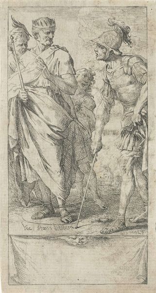 Editor: This is Salvator Rosa’s "Ensign and Three Soldiers," a striking etching from the 17th century. The leader's commanding gesture gives it a theatrical feel. How might this scene reflect the social climate of its time? Curator: Rosa lived in a period of intense political upheaval. Consider the role of the "Ensign" figure - he's literally raising a flag, but what does he represent here? Is this a call to order or a critique of power? Editor: It’s interesting to think about the ambiguity of his gesture, whether it signifies leadership or something more troubled. Curator: Exactly. Rosa's work often challenges the glorification of war, positioning the viewer to question the narratives of heroism. Editor: That's a great point. It's made me see the print in a completely different light. Curator: Examining Rosa's political context really unveils a deeper significance in his art.