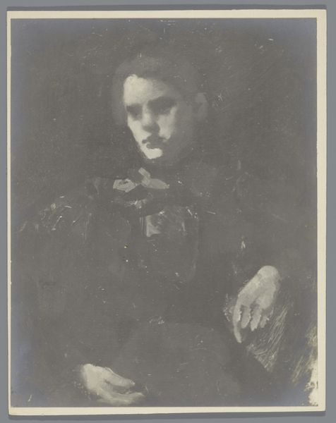 Editor: Here we have George Hendrik Breitner's "Fotoreproductie van een schilderij van een liggende vrouw" created sometime between 1886 and 1910. It's an oil painting and I'm struck by how dark and intimate it feels. What do you see in this piece, and how do you interpret its message? Curator: Well, immediately I think of the late 19th century’s complex relationship with female representation. The female nude had been a staple, but Breitner’s portrayal feels different. The sitter is not idealized; instead, there's a rawness. This suggests an attempt to break away from academic tradition. Editor: So you’re saying Breitner’s challenging the traditional, perhaps objectified, view of women? Curator: Exactly! Consider also Breitner’s association with the Amsterdam Impressionists. They aimed to depict modern, everyday life. What does that imply for a piece like this? Is he simply capturing a moment, or making a statement? Does the ambiguity in her expression contribute to this interpretation? Editor: The sitter’s gaze seems distant. The work avoids obvious emotional cues that further pushes against idealization. Perhaps the painting is about something as ordinary, and potentially radical, as the subject's private life. Curator: Precisely. Also, let’s consider how the artwork might resonate with contemporary discussions around body image and representation. Do you see connections with any modern concepts related to feminism, gender studies, or intersectionality? Editor: That's a powerful point. The work's apparent realism, especially given the historical context of its creation, allows for a contemporary reading. Looking at art as cultural discourse changes my perspective completely. Curator: Absolutely. By viewing art through a lens that engages history and socio-political concerns, we're able to develop a richer understanding and really draw links from then until now.