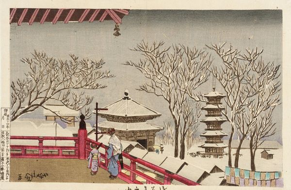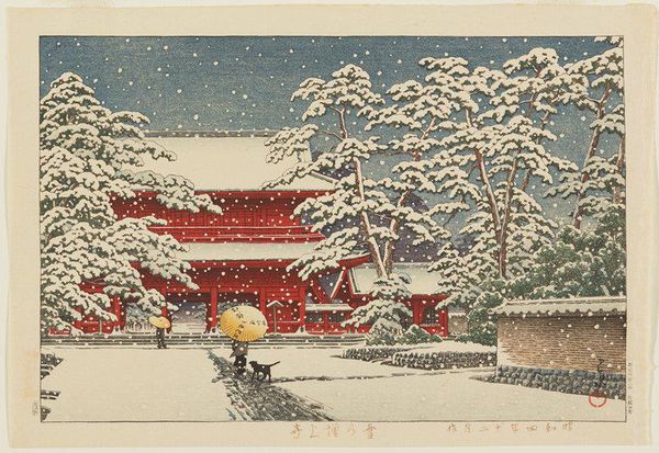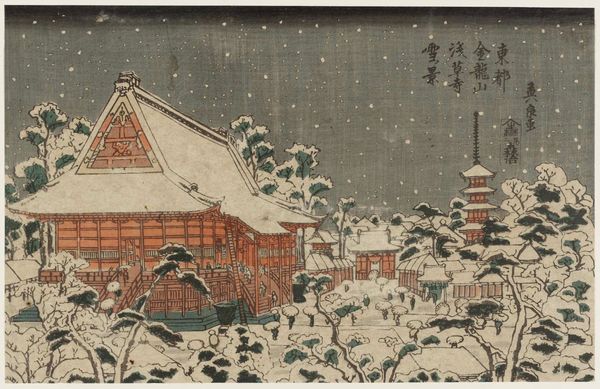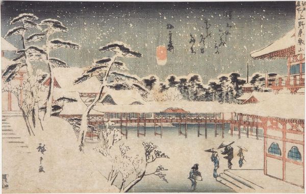Utagawa Hiroshige created this woodblock print, "View of Zōjōji Temple at Shiba in Snow," capturing a scene from the Edo period. It's a moment suspended in time, one where the bustling city of Edo, now Tokyo, is hushed by a blanket of snow. Hiroshige wasn't just depicting a landscape, he was inviting viewers into a world where the spiritual and the everyday intersect. The Zōjōji Temple, a place of solemnity, stands juxtaposed against the figures trudging through the snow. These aren't just anonymous people; they're members of a society rigidly structured by class, making their way through a shared moment of nature's grandeur. The falling snow obscures the world and prompts us to consider our relationship to nature and society. How do we find our way through the storm?