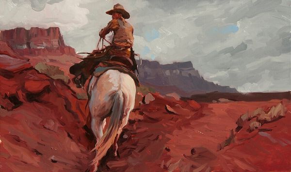 Mark Maggiori created this painting, “The Moon Follower,” with oils, crafting a narrative steeped in the visual language of the American West. Maggiori, who grew up in France, brings an outsider’s romantic perspective to this iconic imagery. The painting presents a cowboy, a figure historically entangled with notions of masculinity, freedom, and conquest, but here he is captured in a moment of quiet contemplation. Overlooking the expansive landscape, the cowboy, bathed in moonlight, appears pensive. This stands in contrast to the often rugged and adventurous depictions of cowboys. The emotional depth of the painting lies in this tension—the cowboy, a symbol of rugged individualism, seems humbled by the vastness of the natural world. “I am trying to show what it’s like to be out there,” Maggiori has said, and the artwork beautifully encapsulates this sentiment. It invites us to reflect on the myths and realities of the American West.