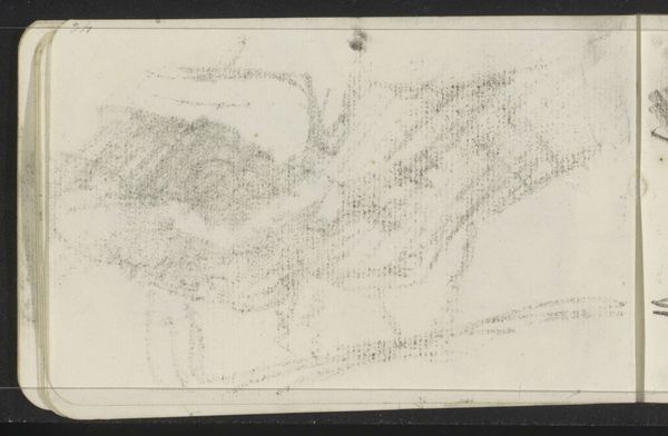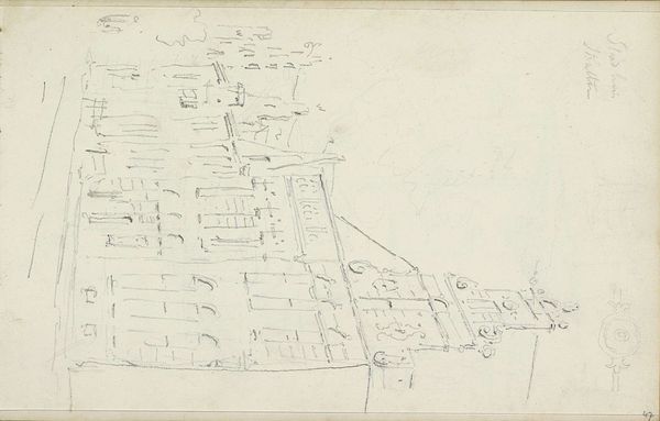 Curator: Well, I'm immediately drawn to the aged paper itself—the tone feels so fragile, almost like holding a whisper of the past. Editor: Indeed. What we're looking at is a pencil drawing titled "Gezicht op de Bovenkerk te Kampen," or "View of the Bovenkerk in Kampen." It's attributed to Adrianus Eversen and believed to have been created sometime between 1828 and 1897. Curator: It certainly feels like a preliminary sketch. An idea in nascent form, you know? All those geometric shapes implying a grand structure, it feels so… suggestive. I wonder what significance that church had for Eversen, why capture it? Editor: Churches, as prominent architectural features, often symbolized the strength and continuity of the community. Eversen likely wasn't just capturing a building, but perhaps a feeling, a connection to the town of Kampen. Think of how deeply embedded religious architecture often is within a city's consciousness, representing permanence but the pencil gives the drawing vulnerability and a more fragile relationship with a historic past. Curator: It's interesting, the incompleteness of the sketch amplifies this sense of impermanence you mention, actually. It's like a memory fading at the edges. This building would have meant one thing to him, a mid 19th century Dutchman, versus its contemporary symbolic meanings and place in our globalized world today. A site like that building in our globalized world today is not necessarily just an active religious location but potentially more for many, including this artist: a relic or touristic attraction, maybe a subject to document rather than directly revere. What do you make of that? Editor: That resonates, especially as our notions of public space continue to evolve. Now, one might wonder if Eversen had fully considered these symbolic tensions at the time—such questioning reflects modern critical engagement rather than necessarily the immediate intent of the artwork at its creation. What I find personally appealing is the unassuming way in which this study communicates with us today despite a vast historical divergence. Curator: So beautifully put. In this drawing, there's a compelling link between our cultural inheritance and the artistic process. Thank you. Editor: A wonderful piece to consider, and as always, such an invigorating conversation.