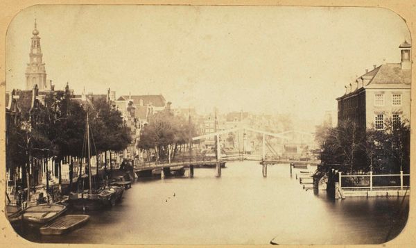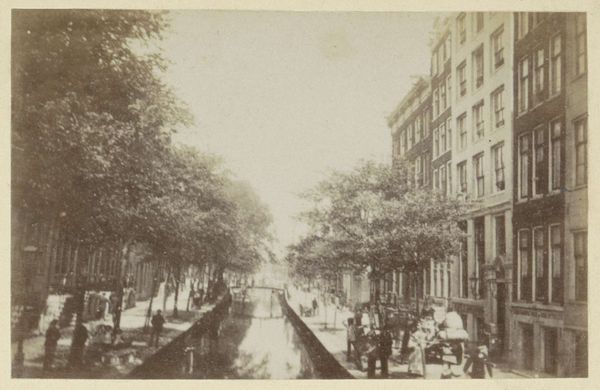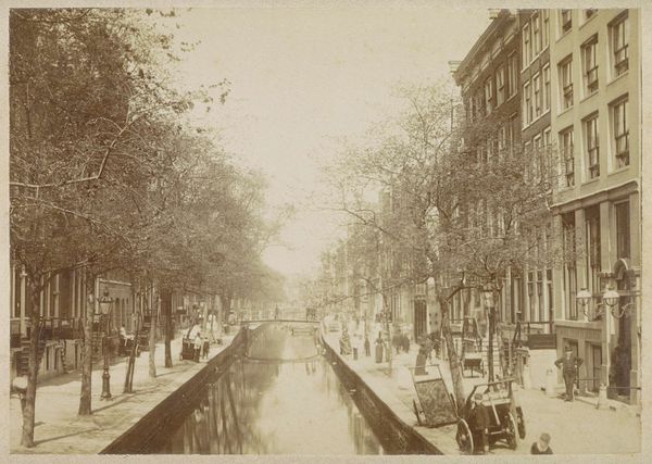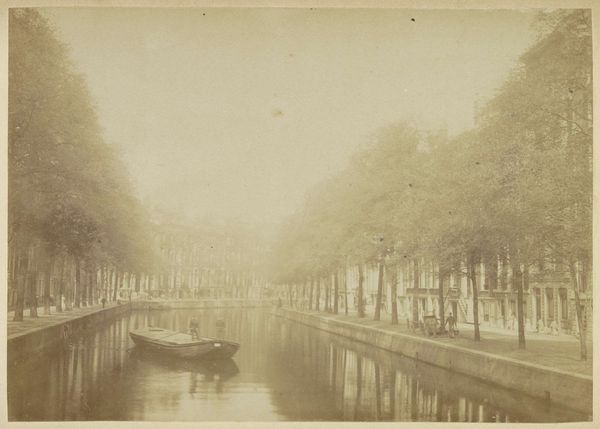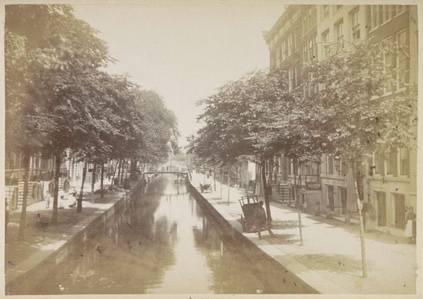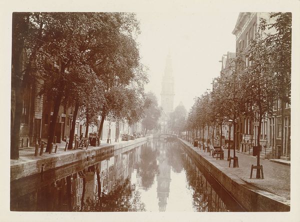 Editor: So, this is “Gezicht op de Keizersgracht,” which translates to "View of the Keizersgracht," attributed to Andries Jager, sometime before 1907. It's currently held at the Rijksmuseum. The whole piece is steeped in sepia tones, giving it this melancholic, nostalgic atmosphere. What jumps out at you when you look at this, especially considering its historical context? Curator: The sepia, as you noted, Editor, acts as a powerful cultural signifier. It's the color of memory, isn't it? Beyond just age, the conscious choice of this tone evokes a yearning, a constructed vision of the past. Do you see how the reflections in the water are almost as defined as the buildings themselves? Editor: I do. It’s like a mirror image blurring the line between reality and reflection. What could that symbolize? Curator: Consider the canal itself. It's not just a waterway; it's a reflective surface, both literally and metaphorically. It captures not only the physical structures but also the cultural values, aspirations, and even the anxieties of the period. The repetitive arches formed by the trees also have meaning. Do they remind you of something? Editor: Hmm, I hadn't thought of it, but the arches over the water... they almost resemble a cathedral ceiling. Curator: Precisely. So what does that visual connection create? It elevates a common scene in Amsterdam to something sacred, timeless. It could be argued the photographer elevated a view of the Keizersgracht to iconic status. Editor: That makes me see the piece in a completely new way. I was caught up in the sadness, but the photo actually tries to imbue something deeper to the urban setting. Curator: It invites contemplation, which perhaps is the strongest cultural message a work can achieve.