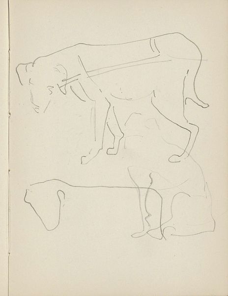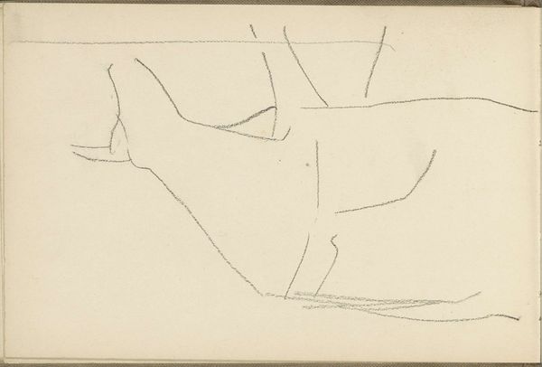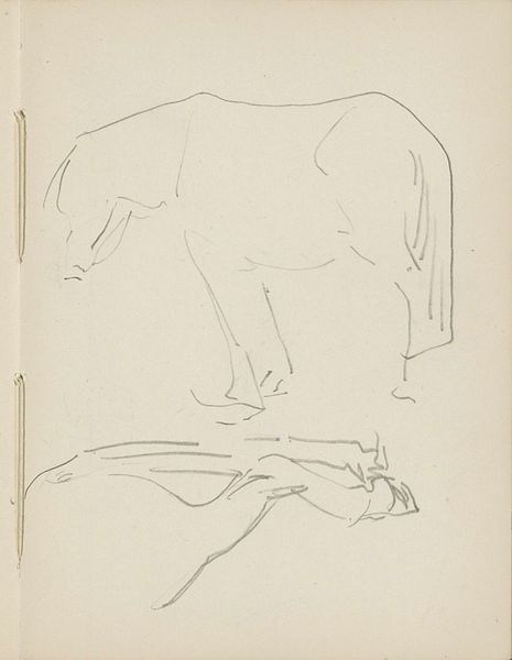 Editor: This unassuming pencil drawing, "Paard," from somewhere between 1906 and 1945 and held here at the Rijksmuseum, feels so raw. You can almost feel the artist working to capture the weight of the animal with such simple lines. What do you see when you look at it? Curator: I'm drawn to the stark simplicity. Look at the materiality—the graphite on paper. The artist wasn't aiming for realism; it's more about the process of observation and recording a fleeting moment. How do you think the means of production, just pencil and paper, influence its message? Editor: That's a great point! Because it's so minimal, it feels incredibly immediate, like a direct connection to the artist’s hand and eye. There's no barrier of elaborate technique. Curator: Exactly. And think about the social context: during that time, drawing was seen both as a preliminary step for ‘high art,’ painting or sculpture, but also as its own art form, available even to amateur artists to pursue art creation. Does viewing it in the Rijksmuseum elevate or alter the artwork to what you expected? Editor: I hadn't considered that duality. Displaying it here definitely lends it a certain significance that maybe the artist didn’t intend. If this were a personal sketchbook drawing, as is tagged, then the act of labor involved, of taking an amateur sketch into an established museum alters it. Curator: The material constraints—the humble materials, the probable speed of execution—speak volumes about artistic accessibility. Considering our talk about means of production and consumption, it is no longer available in an amateur's hands but on display for those of a high art consumption. It democratizes art. What I appreciate is how it allows us to consider what labour went into it from all levels, be it the graphite manufacturer or the artist that produced the artwork on the material. What do you take from that? Editor: I think I initially undervalued this drawing, seeing it only for its subject. But now I'm so curious about how everyday materials and their contexts can drastically shape our view. Curator: Absolutely, thinking materially about art helps us move past purely aesthetic judgements, pushing us to examine who makes art, and how and why.