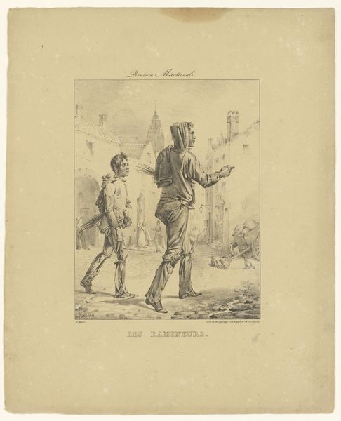 Curator: So, here we have "Two Men Talking About the Train," a pen and ink drawing by Alexander Ver Huell, created around 1865–1866. Editor: My first thought? Nostalgia, I think. Something so utterly simple. Two blokes yarning in what looks like a field, a dog… is that a train in the distance? A lovely composition, everything in shades of sepia and charcoal; somehow comforting, but a little melancholic at the same time. Curator: I think that melancholic feeling speaks to the broader social shifts happening at that time. The arrival of the railway transformed not only the physical landscape, but also how people interacted with it. It’s like the painting’s capturing a moment on the cusp of massive change. Editor: That’s probably why I find myself drawn to the man on the left, the one with the adorable dog. His world, represented by the dog and his walking stick, and probably his fields, looks solid and comforting. Then you have the younger, almost ethereal, pointing somewhere else. He’s ushering change! Curator: Exactly. Ver Huell captures a kind of tension—between the old rural ways of life and this new, industrialized future, symbolized by the train. The posture and dress of the figures really emphasize this. One seems very much of the land, and the other is pointing towards modernity! Editor: I love that the image is very nearly photographic, especially with the open countryside in the back. But there is the handwritten text, under the scene, too; making the artwork quite unique! Curator: Right, and given Ver Huell’s interest in realism, that text is almost a satirical dig at what modern life can bring – "he saw people come, great gentlemen who knew not what a machine such as a steam engine was, was able to do". The industrial changes probably were unsettling for the everyman. Editor: Well, whether or not you like the industrial age or not, the piece certainly encourages conversation. Maybe it is still happening! Curator: It certainly leaves you wondering what they are actually discussing. Food for thought!
