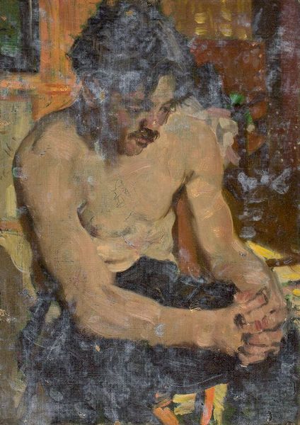 Editor: Here we have "Man in a Cap" by Joseph Lorusso, created using oil paint. There's something really striking about the texture and how the light hits the figure's body. What's your take on this work? Curator: From a materialist perspective, I’m immediately drawn to the visible brushstrokes. The artist’s hand is very present. Consider the implications of oil paint itself: its historical development, its cost, and how those factors contribute to who can create and who is represented. Look at the choice of subject: a working-class figure, perhaps? Editor: A working-class figure, definitely, there's a sort of grit implied by the overall composition. So the very choice of oil paint can signal status and access? Curator: Precisely. And even the style, this almost raw application of paint – it’s a conscious decision to display the labor, the process. Do you think that the shadows play a similar role in materializing certain tensions? Editor: I do. They're a contrast against the brighter areas of the body. What do you think the man's cap might represent? Does it downplay any expected high art presentation and elevate working class ideas and values? Curator: Absolutely. Think about the historical context of portraiture. This isn't some nobleman. This is a deliberate choice, and the cap becomes a signifier of labor, a visual shorthand for a different social reality. And that changes the consumption, doesn't it? Editor: It does. It makes me think about who this painting is for and what kind of story the artist wants to tell about labor and representation. I definitely understand better the intention behind the art creation and consumption now. Curator: Yes, looking at the materials and process can reveal a lot about the social and cultural forces at play.