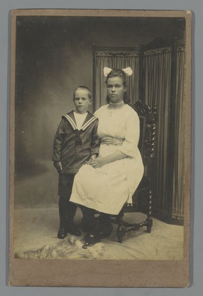 Editor: This gelatin silver print, "Portrait of an Unknown Girl on a Bench" by Wilhelm Frederick Antonius Delboy, dates from between 1887 and 1914. It’s interesting how this standard form of portraiture showcases a level of assumed economic status. What can you tell me about it? Curator: From a materialist perspective, it is the very production of this photographic object and its inherent social context that most interests me. Consider the materials: the silver halide crystals suspended in gelatin, carefully coated onto paper. This reflects a significant industrial and chemical process available to a growing middle class. Editor: So, the photograph itself becomes an object of status, right? Curator: Exactly. And look at the backdrop – likely a painted canvas meant to evoke wealth and leisure. The constructed nature of the scene is a performance of identity, made possible by mass production of not just photographic material, but clothing, props and even constructed realities. Consider the girl's clothing – the labor involved in its making and how it positions her in society. Editor: That’s true. I hadn't really considered the labour aspect. All of those lace details! Curator: Precisely. It's easy to overlook the amount of labor embodied by the sitter's costume or even that rather rough-hewn looking bench. These items would not have been widely accessible to the working class. Editor: This gives me a whole new appreciation for photography from this period. It’s not just capturing an image, but encapsulating a system of production and consumption. Curator: And what is most compelling is that the technology facilitates this process!
