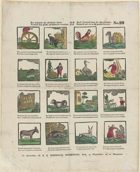 This is a print made by Jan van Lee, featuring thirteen separate scenes, each enclosed in a border to create a grid-like composition on the page. The print relies on a simplified visual language that employs clear outlines and minimal internal detailing. Each scene is a self-contained world, rendered with a functional approach to form. The restricted palette of muted greens and oranges adds a layer of unity across the disparate images and guides the viewer's eye, indicating relationships between elements. The structure of the print directs our gaze sequentially, compelling us to consider each scene not as an isolated instance but as a part of a broader sequence or narrative. The function of the print appears less about aesthetic appeal and more about facilitating a structural comprehension, characteristic of a culture intent on categorizing the world in a systematic way.