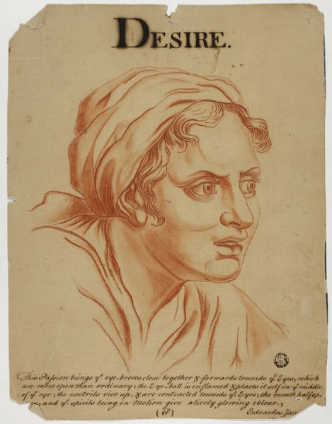 Eduardus Jacobus created this drawing, titled "Admiration," using red chalk on paper. The drawing is dominated by the head and shoulders of a figure, rendered in delicate lines and subtle shading. This creates a sense of classical restraint, an emotional placidity mirrored in the text that frames the image. The artist focuses on capturing the essence of "Admiration" through precise, almost scientific observation. Note how Jacobus methodically describes the minute alterations in the face – the slight lift of an eyebrow, the almost imperceptible opening of the mouth. It’s as if admiration, in Jacobus's view, is not a grand, sweeping emotion but rather a collection of tiny, measurable adjustments in the human visage. Through this formal approach, Jacobus invites us to consider the semiotics of emotion. How do we decode and interpret the visual cues that signal inner states? Is emotion a universal language, or is it a construct, carefully articulated through culturally specific signs?