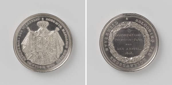 Curator: What an intricate little thing. This object, created by L. Arnaud in 1871, is a medal crafted from metal. It resides here at the Rijksmuseum. Editor: It's quite dense, isn’t it? Visually speaking, there's almost an overabundance of information packed into such a small space. It lacks negative space and rests uneasily upon initial viewing. Curator: I see your point about the visual density. On the front, we have a profile portrait of Vittorio Emanuele II of Italy, encircled by text. And on the back, a collection of industrial motifs, seemingly symbolizing progress and manufacture. Consider the interplay between these two faces of the medal. It's less about space and more about symbolic compression. Editor: And is it successful? While the raised relief is skillfully rendered, I’m not sure the themes meld cohesively. There's a certain disjointedness. Are we meant to focus on the individual or the broader implications of industrial advancements? Curator: The date, 1871, is essential to understanding the piece. It was shortly after the completion of Italian unification, in which Vittorio Emanuele II played such a key part. This object therefore attempts to immortalize that momentous occasion through its artistic devices. The medal could therefore represent an assertion of national identity through the industrial advancements within the state at the time. Editor: So it’s an assertion of progress, visualized and circulated, quite literally, like currency almost, though imbued with significantly higher cultural value than mere tender. Do we know anything about the medal’s distribution and intended audiences? Curator: These commemorative medals often fulfilled multiple purposes. Some were bestowed as honors, others as mementos. Still, it is hard to determine their precise role in the public sphere. Medals offer insight into the societal values of the time, like faith in Italian progress and unity. Editor: Precisely! While my initial aesthetic response leaned toward sensory overload, understanding the socio-historical backdrop infuses it with context, lending a new appreciation for its place as a historical document of sorts. Curator: Absolutely. The piece demands an understanding of the historical context to appreciate its nuances. It is through that historical understanding that the forms, portraits, and allegories crystallize to their significance.