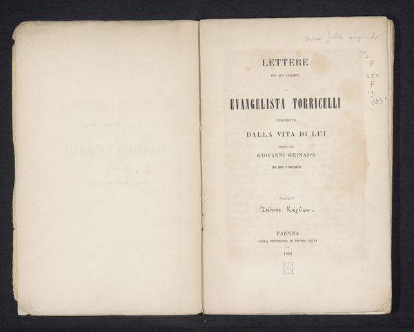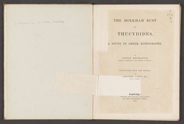 Curator: Here we have a book from 1866, "Life and Letters of Frederick W. Robertson, M.A." It's an open book; on the right is the title page, printed on paper. What are your initial thoughts? Editor: Well, I immediately notice the texture and visible aging of the paper. It evokes a feeling of historical weight, you know, touching something that someone would have made such a long time ago. You see the slight imperfections in the print, which makes you think about the labor behind such printed work at that time. Curator: Indeed. Note the deliberate arrangement of text on the title page; the hierarchy established through varied font sizes draws the eye to Robertson's name and then the editor's. Observe, too, the framing of text by blank space—it enhances the readability, contributing to the text's function and inherent design value. Editor: That’s a very formal reading. I can't help but consider the manufacturing. Paper production, printing processes, binding… Someone prepared the ink, and some people will buy and read the words of this book. It emphasizes its physicality; it becomes more than simply information, but an object to produce, disseminate, and consume. Curator: Of course. I see the structure as reflective of the Victorian focus on biographical narratives. Robertson was clearly important, as this is the fourth edition! Editor: It makes me think about who was buying such books, middle-class professionals probably; considering its role in disseminating particular ideas at the time. Was Robertson’s life a vessel of middle-class virtue, maybe? Curator: One could certainly apply such a reading through historical context and semiotic analysis! The careful placement of the words constructs not only information, but a visual testament to Robertson’s enduring legacy. Editor: Absolutely. So, considering materiality enriches our reading beyond mere content analysis, focusing us back on both production and reception as critical for meaning. Curator: And from that viewpoint, the artistic structure helps create that reception for diverse interpretations to flourish. Editor: Quite so. This book’s journey as an object made and read. It shows that books as an accessible art and object have power!