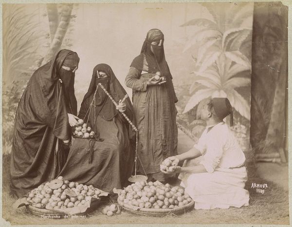 Editor: This photograph, taken in Java between 1880 and 1905 by Kassian Céphas, depicts a dance performance. It shows a dancer with musicians in what seems to be a staged setting. I'm struck by the direct gaze of the dancer. What do you see when you look at this image? Curator: Immediately, I notice the constructed nature of this image, hinting at deeper cultural layers. The backdrop depicting the exotic 'outdoors' contrasted with the woven screen suggests the constructed image. The Ronggeng dance itself is highly symbolic, isn't it? A ritual, almost a dialogue between the dancer and the musicians and onlookers, each symbol carries immense cultural weight. Look at the dancer's attire, its colors and patterns. What do those evoke for you? Editor: I hadn’t considered it so staged initially. The attire does seem carefully considered, perhaps indicating status, or a specific narrative within the dance. Is it about a conversation, then, more than mere entertainment? Curator: Exactly! Consider also how the musicians surround and support the dancer, both physically and symbolically. The gamelan music is crucial—it's not merely accompaniment but an integral part of the dance's narrative. And look closer – are they posed, or are they truly in movement and interaction? What does it tell us about how cultural identity was presented, and even perhaps consumed, during that era? It is photography so its documentary character makes it seem candid when really its not, and probably very posed. Editor: I now see the image as deliberately constructed. The staging, the attire, it all suggests a conscious performance for the camera. Curator: Precisely. These photographic symbols invite us to contemplate the layers of performance and identity present in Javanese culture and photographic symbolism in general. We come to understand visuality, symbolism and identity more closely in photographs, not necessarily so directly observable or obvious in, say, painted portraits. Editor: It’s fascinating how much can be unpacked from a single image. Thanks to your insight, I've gained a much deeper understanding of its cultural context and hidden meanings.