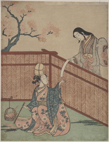 Suzuki Harunobu's woodblock print presents a delicate scene with two figures rendered in muted, earthy tones against a subtly textured background. The composition balances the stillness of the seated figure with the gentle movement implied by the standing figure offering a letter. The vertical lines of the screen behind the figures contrast with the organic forms of the maple tree and the rounded shapes of the figures themselves. This juxtaposition highlights the interplay between the man-made and the natural, a common theme in Japanese art. Harunobu uses the flat planes of color and simplified forms, typical of ukiyo-e prints, to create depth and spatial relationships. The delicate lines and soft colors suggest a quiet intimacy, inviting contemplation on the nature of communication and connection within social structures. These formal elements reflect a broader aesthetic sensibility valuing restraint and refinement. Ultimately, it’s through Harunobu’s careful arrangement of shapes, lines, and colors that the print invites us into a world of subtle emotion and understated beauty.