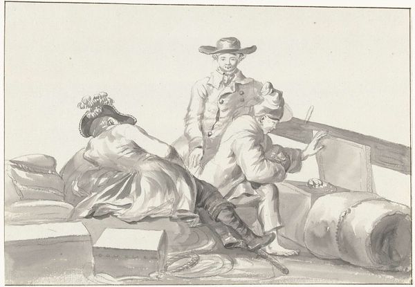 Louis Ducros created this watercolor drawing of crew members on a ship in the late 18th century. The men are captured in moments of repose, offering an intimate glimpse into the lives of those who navigated the seas. The Age of Exploration and burgeoning global trade deeply shaped the identities of sailors. These men, often from marginalized backgrounds, faced harsh conditions and long periods of isolation. Ducros depicts these figures with a sensitivity that humanizes them, moving beyond the romanticized portrayals common at the time. Consider the emotional implications of their expressions. The figure lying down seems lost in thought, perhaps dreaming of home. Another props his head up with his hand, conveying exhaustion or boredom. This piece reflects the complex interplay between individual experience and the larger forces of commerce and colonialism that defined this era. It reminds us to consider whose stories are told and whose are often left unheard.