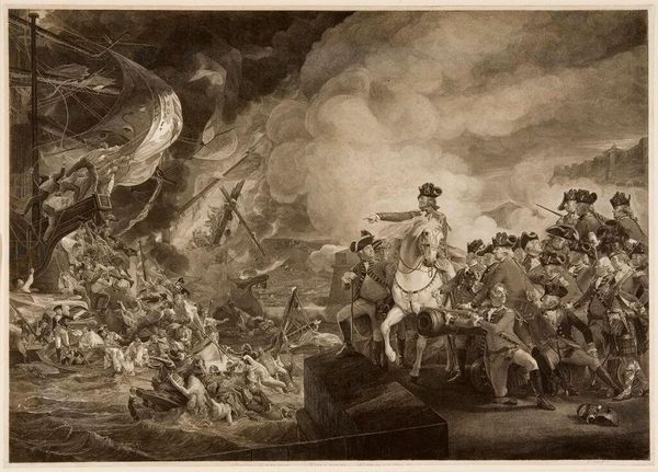 Curator: William Sharp created this engraving entitled "The Siege and Relief of Gibraltar." The piece captures a pivotal moment during the Great Siege. Editor: The mood is immediately chaotic and violent. The swirling smoke and wreckage suggest a scene of intense conflict and destruction, doesn't it? Curator: Absolutely. The image is filled with visual symbols of power, resilience, and even sacrifice. The heroic figures standing firm against the backdrop of naval devastation represent the steadfast defense of Gibraltar. Editor: It's impossible to ignore the colonial implications, though. Who exactly are these figures, and what are they defending? This image plays into British imperial narratives of heroism. Curator: The figures stand for the strength of the British empire at that time. The image evokes the long history of siege warfare. Editor: Yes, and let’s remember who was being sieged. It is a selective narrative, reinforcing the dominance of one group through potent visual messaging. Curator: Indeed. Considering these complexities enriches our experience with the artwork. Editor: Precisely, as we navigate this piece together, we can start to grasp the multiple, intertwined stories it tells.