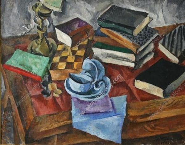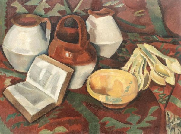 Editor: This is Roger Bissière's "Nature morte avec mandoline," an oil painting that, well, depicts a still life with a mandolin. I'm really drawn to its fragmented forms, that hint at objects rather than defining them explicitly. How do you interpret this work, considering its symbolic implications? Curator: Bissière seems to be less concerned with representation, and more with suggestion. See how the mandolin itself rests above the other items. Doesn’t it remind you of the constant, underlying presence of art and beauty in everyday life? The symbolic weight of these ordinary items - the fruit, the newspaper, the instrument- create a memory. Editor: I didn’t see it like that, that it’s like a constant, or a cultural memory even! The flattened shapes and muted colours…it felt more like a quiet deconstruction to me. Is there a message? Curator: Perhaps that’s *part* of the message. The very act of breaking down forms invites a kind of reconstruction in the viewer’s mind. What symbols emerge *for you* in that process? Bissière plays with our expectations, pushing us to piece together a deeper narrative through visual cues. The ordinary elevates to…extraordinary? Editor: Hmmm. So the “story” emerges from the familiar. I think I can appreciate how that would encourage us to discover, or *remember*, significance in everyday objects. I will not see it the same way again! Curator: And in remembering the everyday, we also hold onto memory and a piece of our collective cultural history.