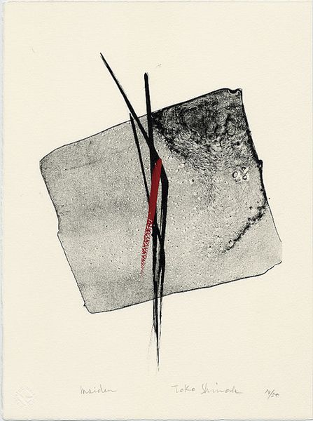 Editor: This is "Katachi," a graphic art piece by Toko Shinoda, created with ink. It strikes me as quite dynamic; the composition is simple, yet the stark contrasts create a real sense of movement and tension. What do you see in this work, looking at it from a curatorial perspective? Curator: I am particularly interested in the material processes involved. Consider the artist’s choice of ink. What kind of ink? How was it applied? The nuances in the black areas, some dense and others lighter, suggest variations in pigment density and layering techniques. Even the red squiggles -- are they another form of ink? Are they a commentary? Editor: That's a great point. I hadn't really considered the red lines as part of that conversation. I was drawn more to their disruption to the otherwise blocky geometric shapes, like a rogue element. Curator: Exactly. But beyond aesthetics, let's think about production. This isn't mass-produced. There's the labour of hand application, the artist's focused intention. The materials, while simple, possess inherent value shaped by Shinoda’s skill. Were these high-quality inks typical of calligraphy practices, or industrial? I wonder if that can suggest a comment on either craft vs commodity. Editor: I see what you mean. By focusing on the materiality and the processes of creation, it moves beyond just being a composition to becoming a kind of… commentary? Curator: Precisely. This is not merely abstraction; it’s abstraction rooted in a material reality. Editor: It is fascinating how looking through the lens of materials opens up a whole new way of interpreting the work, revealing potentially radical ideas about creation, labor and value. Curator: It certainly does. Considering materials challenges that traditional boundary between high art and the day to day that sustains it.