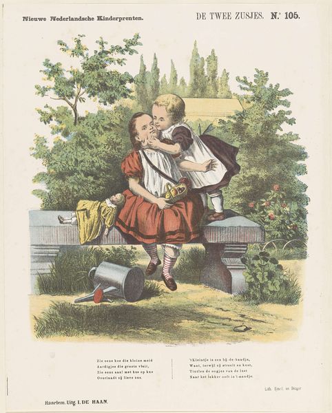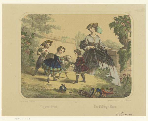 Curator: This unassuming lithograph, "The Boy and His Hobbyhorse," created sometime between 1875 and 1903 by Jan de Haan, presents us with much more than a simple childhood scene. Editor: Yes, it seems sweet at first glance – the naive style, the boy with his paper hat and hobbyhorse. But his expression seems almost...stern. What do you see in this piece? Curator: I see a snapshot of childhood imbued with the rigid social structures of the time. Look closely – the text accompanying the image speaks directly to "boys," perhaps subtly reinforcing societal expectations and gendered play. What does the hobbyhorse represent, and for whom? Is this idealized childhood accessible to all children, or is it limited by class and gender? Editor: That’s a fascinating point. I was so focused on the image itself, I didn’t consider the targeted audience within a broader societal context. It's interesting how the seemingly innocent imagery interacts with social hierarchies. Curator: Precisely! And think about the materials: lithography, a printmaking technique that allowed for mass production. Who had access to these prints, and what values were being subtly transmitted through them? Were they tools of education or entertainment, or something more insidious, subtly shaping young minds to accept existing power structures? Consider how "play" could be considered an activity associated with power. Editor: So you're suggesting that even something as seemingly harmless as a children's print can be a vehicle for social and political ideologies? I never considered looking at it from that angle. Curator: Absolutely. Everything, including art created for children, exists within a specific historical and social context. Questioning those contexts is key to understanding the full picture. Editor: That’s a really insightful perspective. It makes me realize how much I still have to learn about interpreting art within a broader historical framework.