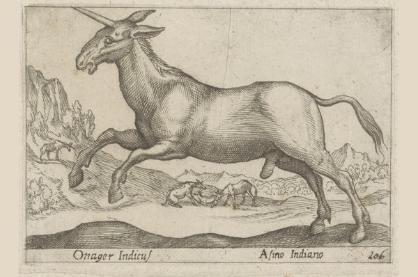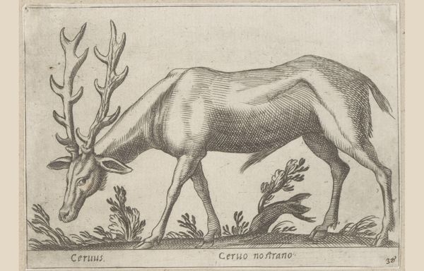 Curator: Alright, let's dive into this intriguing print—a work entitled "Damhert" by Antonio Tempesta, dating back to before 1650. It's currently housed at the Rijksmuseum, crafted through engraving, among other techniques. And, it presents a spotted deer. Editor: My initial impression? Energetic! But almost comically awkward too, in its frenzy. The deer seems caught between elegance and total panic. Those strangely spotted flanks though... I don’t quite get what the spots are about. Curator: The stippling really does give it an unusual texture. Considering Tempesta's era, he likely wasn’t going for photorealistic detail. The spots could function symbolically – a kind of marker denoting the deer's wildness, perhaps, or alluding to themes of hunting. Or they might represent the ephemeral quality of life itself, who knows? Editor: Hmmm… or just imperfections. Let's examine the composition. The deer occupies most of the frame, yet the simple landscape asserts itself at the bottom. See how that horizontal emphasis contrasts with the animal’s dynamic diagonals? Curator: I appreciate how the stark black and white amplifies that feeling of motion—that anxious leap. It’s so different from say, a lush, colourful painting of the same subject. This feels urgent, less about beauty, more about primal instinct. What does that background tell us about its environment and behavior, do you think? It is all line, form and minimal shading and contouring? Editor: Barely sketched-in vegetation, isn't it? Functional but, yeah, pretty spartan. The landscape isn’t really meant to define its habitat but more of the general landscape tradition than a particular location, which pulls our focus right back to the figure of the deer itself. I agree about that heightened immediacy with the linework! It accentuates that frantic quality. Curator: In our age, with such polished ways to show wildness, its fascinating to go back to something so unvarnished and visceral. Makes me consider the layers of artifice we build into modern visual storytelling. Editor: Absolutely! Analyzing Tempesta’s choices in this print lets us perceive these deeper dimensions in familiar images. This piece, though simple, really pushes us to contemplate how visual choices affect meaning. Curator: Indeed. A baroque deer dashing through time to give us some food for thought!
