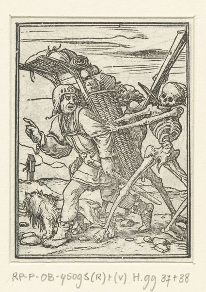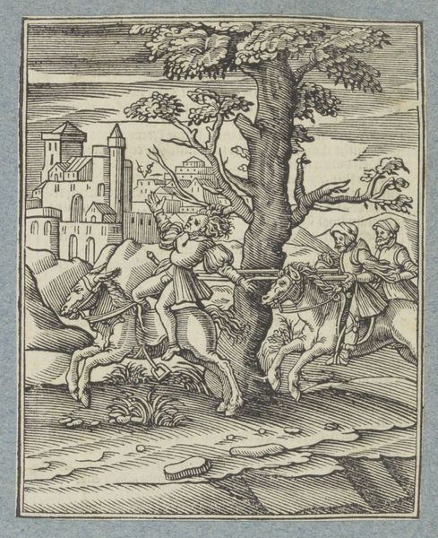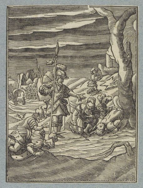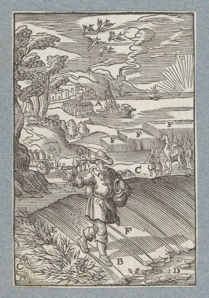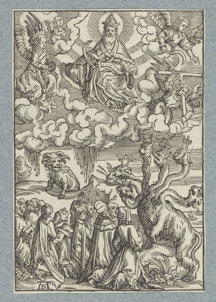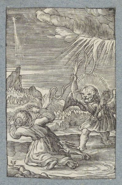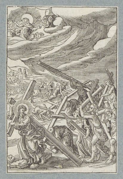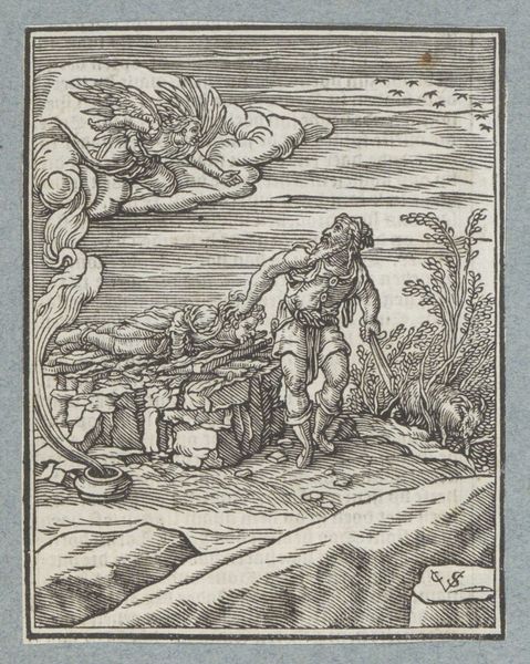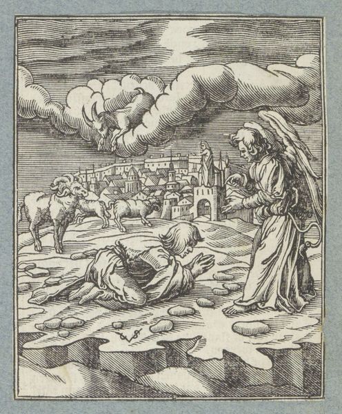 This small woodcut, created by Christoffel van Sichem II, depicts Jacob's Ladder, a powerful vision from the Book of Genesis. Here, we see Jacob asleep, a stone for his pillow, dreaming of a ladder stretching to the heavens. Angels ascend and descend, bridging the earthly and divine realms. The ladder is not just a physical structure; it is an axis mundi, a symbolic connection between humanity and God. You might recall similar motifs in ancient Near Eastern art, like the ziggurats of Mesopotamia. They also represented a pathway to the divine. The emotional resonance of this image lies in its promise of connection and hope. This yearning for transcendence is a universal aspect of the human psyche, reflecting our deepest desires for meaning and purpose. The image of angels moving between earth and heaven has been repeated in various forms throughout history, evolving to suit the changing cultural context, yet retaining its core message of divine intervention. The symbol is a powerful reminder of how images can act as vehicles for transmitting fundamental human experiences across time.