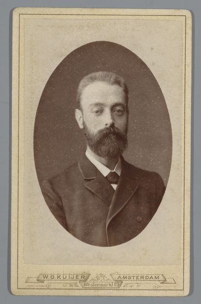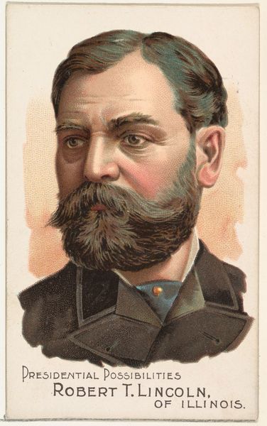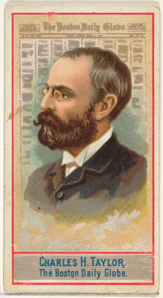 Editor: Here we have Joseph Pulitzer, The New York World, created around 1887 as a lithograph print. The illustration seems very much a product of its time. What social or political statements can we read in it? Curator: It's important to recognize that this image comes from a series of cigarette cards. We might want to consider it less as a straightforward portrait and more as a commercial artifact, embedded in the political economy of its time. It evokes a very romantic view of entrepreneurship and "American" success... But at what cost was that success achieved? Who benefited and who was marginalized? Editor: I see what you mean! It feels almost celebratory, this idealization of a powerful man. Curator: Exactly. It reflects the narratives that were being constructed and circulated. How did images like this shape public opinion? How does Pulitzer’s power intertwine with that of the press, particularly at that historical juncture, when media was truly taking hold and establishing its role? The card romanticizes Central Park. The park, designed in part to assuage class tension and unrest, represents a utopian ideal, maybe at odds with the often stark realities of that same period. Editor: So the picture can be viewed as propaganda, as part of the creation of the 'American dream'… What should contemporary audiences consider? Curator: Consider how power operates through seemingly innocuous images. It challenges us to ask critical questions about representation and ideology even in something as simple as a cigarette card. Editor: I guess I had viewed this portrait very simplistically, just another work of that period. I now realize how layered images can be with their particular messages. Thank you. Curator: It’s precisely that awareness that is critical in today's world. Thanks!
