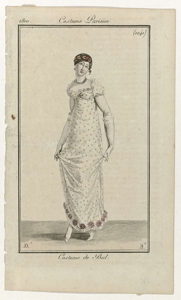 Curator: Here we have "Journal des Dames et des Modes, Costume Parisien, 15 mars 1817" by Pierre Charles Baquoy. This particular impression, dating from 1817, comes to us from the Rijksmuseum collection. Editor: It feels almost ghostly. She's rendered so delicately, like a faded memory in the palest of greys, and her hands seem weightless, barely touching the rose. Curator: Exactly. These prints were designed to circulate fashion trends. The labour involved—etching, engraving, printing—was crucial for the rapidly changing world of Parisian style. It speaks volumes about early consumer culture. Editor: It’s amazing to think about all that meticulous handcraft devoted to, essentially, ephemera. Today’s fast fashion has nothing on this; the speed of trend-setting has increased dramatically but then relied so completely on artisans, on the physical process. I love the juxtaposition. Curator: And consider the target audience. These weren't accessible to all women. It illuminates class dynamics—who could afford to partake in these styles, and who was employed in their production and distribution. Editor: Right, so there's the dreamy image of the lady, contrasted against the work necessary to bring that image, and her dress, into being. Does that ornate ruffled trim on the dress signify something about her wealth? The volume seems impossible! Curator: The detailing certainly signifies expense and taste. The print serves as both inspiration and advertisement, fueling desire while also showcasing available materials and skilled labor. Editor: Thinking of it as an artifact of material culture really brings it alive. Curator: Indeed. By acknowledging the processes of creation and consumption surrounding this image, we understand its function far beyond mere decoration. It mirrors society, economy, and the shifting sands of taste. Editor: Makes you want to reach out and touch history. Though I suspect the Rijksmuseum might frown on that. Thank you, the dress looks divine in my minds eye now.