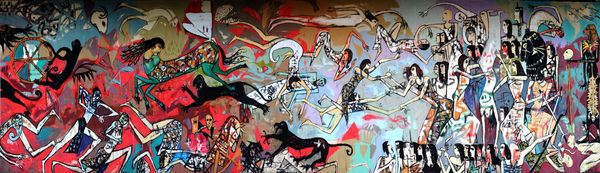 This untitled painting was created by Alaa Awad, using acrylic on canvas, a decidedly modern material and surface. The application of paint is quite flat, and the texture of the weave barely comes through, which keeps our attention on the subject. The painting depicts a procession with women, some on horseback, referencing both folkloric traditions and contemporary social issues. Notice how the figures are repeated, lined up one after another, an effect enhanced by the way they are surrounded by thin, vertical strokes. This creates a rhythmic sense of repetition, almost like a textile pattern. But more importantly, it speaks to the collective effort necessary to enact political change. It's as though the artist is both celebrating the long, rich cultural heritage of Egypt, and recognizing that only through concerted action will these traditions be carried forward into the future. It’s a reminder that materials, making, and context can enrich our understanding of art, beyond traditional ideas of craft or fine art.