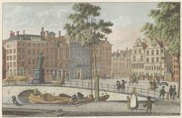 Curator: What a charming watercolor! There’s something about the subdued palette that invites closer inspection. Editor: Yes, the muted tones create a certain tranquility. It feels more documentary than artistic. Curator: That's quite fitting given the subject. This is "Portugese Synagoge te Amsterdam, ca. 1790," likely rendered by Carel Frederik Bendorp sometime between 1786 and 1825. The Rijksmuseum is fortunate to have it. It’s a rather excellent example of neoclassicism showing everyday life in Amsterdam with architectural precision. Editor: It definitely captures a sense of the period. The Neoclassical architecture projects an air of order and rationalism but it feels slightly undone by the whimsy of the genre scene unfolding in the foreground with playing children and strolling figures. It projects two ways of life – and possibly values! - within one piece. Curator: Precisely. That juxtaposition really draws you in. Notice the careful depiction of the synagogue's façade. Bendorp focused intently on the rhythm of the arches and pilasters. It echoes a reverence for classical forms that speaks volumes about the cultural aspirations of the time, to create these monuments but for a faith tradition in Amsterdam, a safe-haven! Editor: And the light! It seems so diffuse, bathing everything in this soft, almost egalitarian glow. The effect normalizes the Jewish population within Amsterdam city-scape. The dog running in the street. The gossiping ladies seated at the park’s edge. Curator: The symbol of the dog might signal fidelity and watchfulness. Synagogues, historically, had to watch themselves...but that interpretation would need more research. The fact that the watercolor survives also indicates how architectural painting and watercolors of the day acted like postcards – images and sites circulated in these popular mediums and memorialized sites for their consumers, many who possibly traveled! Editor: A subtle detail I noticed is how the artist employs this higher vantage point. The higher placement offers a level of control and commentary as it watches and sees Amsterdam daily life unfold below. Curator: A great observation. Looking at it this way has certainly unlocked new dimensions within a familiar cityscape! It makes me want to know even more about Bendorp's choices here. Editor: Agreed. It underlines the painting’s complexity. Much more than just a picture postcard after all.