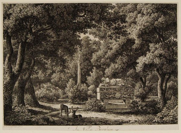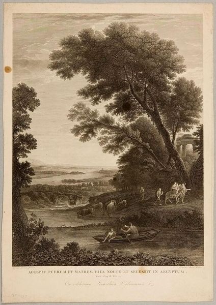 Curator: This is Charles André Malardot’s "Landscape with Three Flamingos at the Edge of a Swamp," held here at the Harvard Art Museums. It presents such an intricate scene. Editor: It does feel a bit somber, despite the flamingos. The dense trees and detailed etching give it a serious, almost melancholic air. What is your read on the social context? Curator: I think we can see this through the lens of environmental anxieties. The swamp, a space historically viewed with both fear and fascination, becomes a stage for these exotic flamingos, perhaps gesturing towards a changing world. Editor: Interesting. I'm drawn to the medium itself. The labor involved in creating such fine detail, the tools used for etching—they all speak to a specific kind of artistic production. Curator: Yes, and that production is inseparable from its time. The choice of landscape, the inclusion of these particular animals, all point to a certain worldview, a way of understanding our place in the world. Editor: Right. I appreciate the consideration of both the technique, and the world of meaning suggested.