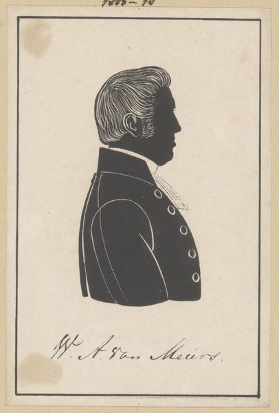 Editor: This is "Silhouetportret van Jan Visscher," a silhouette portrait by Pieter Barbiers IV, dating sometime between 1809 and 1848. It’s a pencil drawing on paper, currently at the Rijksmuseum. I'm struck by the starkness of it. It feels very formal, almost severe. What stands out to you in this work? Curator: The silhouette itself carries a strong symbolic weight. Think about it: reducing someone to a shadow, an outline. It’s a powerful act of reduction, but also preservation. In psychological terms, it speaks to how we create internal representations of people, boiled down to essential forms, iconic shapes. Do you think this flattening dematerializes him or rather distills his cultural relevance? Editor: That's fascinating. I hadn't considered the psychological aspect. I guess I assumed silhouettes were simply a quicker, cheaper way to have a portrait made, a kind of proto-photograph. Curator: True, but the black and white also evokes a certain sense of finality, doesn't it? A sense of memory. During the Romantic era, this connects to an emerging interest in folk traditions, in ghosts and spirits. A silhouette captures a person at a specific moment, holding a particular meaning while alive that can still evolve generations later, like ancestral veneration. Editor: I see what you mean. The shape itself becomes a symbol, a kind of shorthand for the individual. Curator: Exactly. It begs the question: What aspects of a person do we choose to remember? The artist here makes several conscious choices regarding which facets of this person, Jan, will endure symbolically through visual imagery. It prompts consideration on what facets of our selves we might choose to be known for and memorialized by. Editor: I hadn't thought of silhouettes in such depth before, beyond just a simple portrait. Thanks for pointing out all of the different historical and cultural references present within this artwork. Curator: It goes to show you that simplicity can conceal profound meaning, with images as gateways for deep cultural memory.