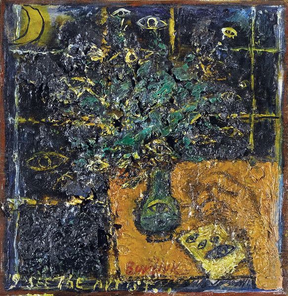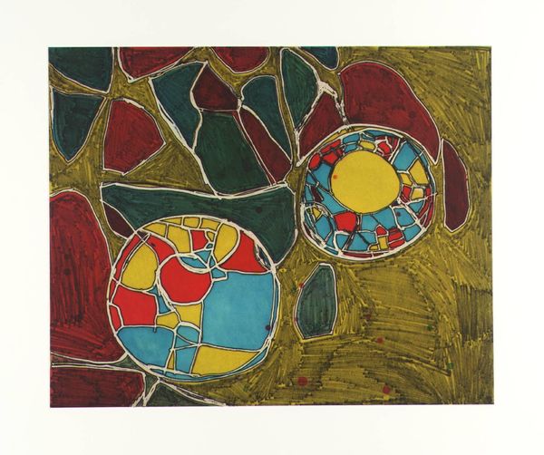 Editor: Joe Tilson's "Liknon 3" is quite striking, isn't it? There's a central still life, surrounded by what looks like a deconstructed pattern. The colours are so bold. What's your take on this piece? Curator: It sings, doesn’t it? To me, it’s all about layers, both visual and conceptual. Tilson was deeply inspired by classical mythology. Notice the "Liknon" itself – a winnowing fan, a symbol of purification in ancient rites. It’s about separating the wheat from the chaff, visually and spiritually. What do you make of that? Editor: So it's not just about the pleasing shapes and colours? Curator: Never just that, is it? It's a bit of a puzzle, a visual poem waiting to be deciphered. That central image feels almost like a sacred offering. Perhaps the artist is inviting us to contemplate what truly nourishes us. Editor: I see what you mean. It makes me want to delve deeper into mythology and art history to fully appreciate this. Curator: Exactly! That's the magic, isn't it? Art inviting us to explore.