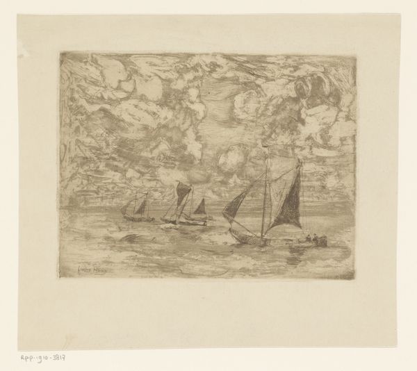 This is Wolkenlucht boven water, made by Frans Hens, using etching, in the late 19th or early 20th century. The etching process begins with a metal plate, usually copper or zinc. A waxy, acid-resistant ground is applied, then the artist draws through the ground with a needle, exposing the metal. The plate is then immersed in acid, which bites into the exposed lines, creating grooves. The longer the plate sits in the acid, the deeper the lines become. This particular etching is characterized by a rich, velvety texture in the sky, achieved by the artist’s control over the biting process. This gives the clouds a strong atmospheric presence. The water below is much more lightly articulated. The appeal of the print resides in its replication of this specific view of the landscape, a skill which relies on acute observation, and a complex industrial process. In this way, Frans Hens both embraced and transformed an industrial process to his own aesthetic ends.