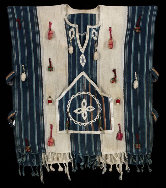Editor: Here we have a "Camel Bag," believed to be from the 20th century and created by the Tuareg people. It’s a mixed-media textile piece. I find its texture so intriguing – the leather, the tassels, the embroidery. What stories do you think it holds? Curator: Oh, it's whispering tales of the Sahara, for sure! I see generations riding on those threads. What captures my imagination is the way form follows function. Practical, of course, designed to carry precious goods across the dunes, but utterly transformed into a visual poem. It's a perfect intersection of necessity and beauty, don’t you think? Editor: Absolutely! But do you think the patterns hold specific meanings or are they more decorative? Curator: Both, I suspect. Knowing the Tuareg, a deeply symbolic culture, every line, every knot, would hum with intention. Think of it as their language woven into the fabric. Even the color choices aren’t arbitrary, each evoking certain elements and ideals within the culture. What elements jump out at you? Editor: Well, the central square draws my eye—with the nested geometric patterns of red, black and white—which reminds me of certain landscapes that could symbolize places where they travel. The repeated circle shape feels also important. What do you think? Curator: You've touched upon the very soul of it! Circles symbolize protection, cycles of life, a reminder that even in a seemingly barren desert, there is an infinite abundance. It’s a cultural touchstone and an amazing way of capturing their hopes, heritage, and the sheer beauty of resilience within a piece of art meant for everyday life. It's powerful, isn’t it? Editor: It is. Now I look at it with entirely different eyes. I can see how a daily item can transform into something carrying history, purpose and so much symbolism. Curator: And isn’t that the magic of art? To transform our vision and help us see more than we initially believed possible?