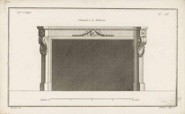 Curator: This detailed ink and paper drawing is by Lorenzo Cardelli, dating from around 1790 to 1810. It’s titled "Schoorsteenmantel met een reliëf van Venus die Adonis beweent, met daaronder een plattegrond," which translates to "Mantelpiece with a relief of Venus lamenting Adonis, with a floor plan below." Editor: My initial impression is one of formality and measured grief. The heavy lines and balanced composition give it a somber weight. What stands out most to me is the striking contrast between the dark recess and the classical ornamentation. Curator: Absolutely. Let's consider the context. This work reflects the Neoclassical movement. The choice of ink and paper allows for the precision needed to mimic the forms and ideals of classical antiquity, focusing on clear lines and balanced forms to demonstrate refined skill and intellectual rigor, not merely aesthetics. Editor: The subject matter, Venus mourning Adonis, speaks volumes. It's not just a story of loss; it represents cyclical themes of death and rebirth, beauty and tragedy—all deeply rooted in ancient mythology. The placement of the relief above the mantel suggests the importance of remembrance and perhaps a family’s connection to these timeless narratives. Curator: And the choice to depict a mantelpiece, something quite literally domestic and central to a home, elevated with classical, even allegorical, themes! We see a blurring of boundaries between 'high art' and practical craft, reflecting on changing concepts of labour, class and domesticity during this period. Editor: The lower half of the drawing is particularly fascinating. It grounds the idealized scene above within a practical space, as we see an architectural diagram with technical features to contextualize it even further. I read that duality as highlighting a tension of sorts, perhaps mirroring real lived human conditions of grief within an aspirational design for sophisticated domesticity. Curator: Precisely, the artist here offers a complex reflection on societal shifts through a proposed object, crafted meticulously using specific materials to appeal to very specific audiences. Editor: It also presents a stark meditation on the transient nature of beauty. The symbols carry weighty emotional stories which in turn can remind us how past feelings connect to our present and futures. Curator: Looking at it through that lens makes you rethink of art history, isn't it? Editor: Indeed. There is an undeniable weight and story contained in these design objects that is truly moving.