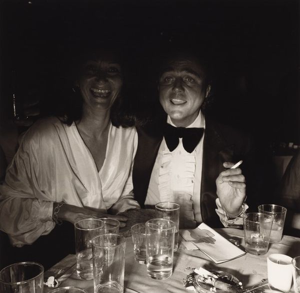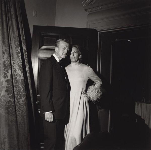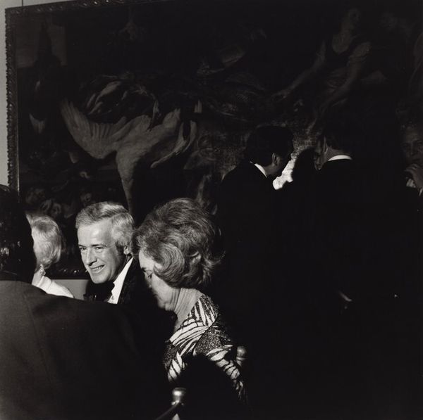 Curator: Larry Fink's photograph, "Russian Orthodox Fund, New York City" captures a moment seemingly suspended in time. The stark contrast evokes a somber, almost theatrical mood. Editor: It's more than just mood, isn't it? Fink captures a stratum of society often shielded from view, revealing its rituals and performances. The photograph becomes a case study in class and power dynamics. Curator: True, but note the composition—the subjects are arranged almost like a tableau, the harsh lighting emphasizing every line and texture. The woman's gaze, direct yet detached, draws you in. Editor: It’s a gaze that speaks volumes about the gaze turned back on her, the expectation of wealth, status. Fink cleverly implicates the viewer. What is our role in this theater? Curator: Ultimately, Fink presents us with a mirror reflecting back our own assumptions and biases about privilege. Editor: Precisely, it’s a stark reminder that art can reveal uncomfortable truths, and that beauty often masks deeper societal structures.