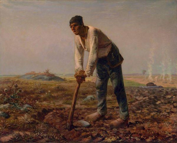 Curator: What strikes me immediately about Jean-François Millet's "Peasant Spreading Manure," painted in 1855, is how earthy and, frankly, unromantic it is. Editor: Earthy is right. It’s less about idyllic farmland and more about…well, the materials. You see the peasant laborer, rendered with dignity, but what I can't stop looking at is what he’s spreading. Actual manure. Not something you typically find in “high art”. Curator: Precisely. And that challenges our notions of beauty and worth, doesn’t it? Millet uses the peasant figure almost as a Christ-like symbol. Spreading manure might not seem glamorous, but consider the cycle of life embedded in that simple action: death and decay fertilizing new growth. This embodies deep cultural and religious understanding about death and resurrection. Editor: The means of production become the subject matter itself. Look at his simple clothing and those worn clogs. They're testaments to the back-breaking labour. Also, what about the paint itself? The way the ochres and browns build texture mirrors the richness, maybe even the thickness, of the manure being spread across the field. He doesn’t shy away from the messy realities of agriculture. Curator: Messy, yes, but also full of a strange kind of holiness. Note the setting sun, how it almost halos the figure of the peasant. He's engaged in profoundly meaningful, if unglamorous, labor, intimately connected to the soil, to sustenance, to a way of life quickly vanishing even at the time of its creation. And the other figure, she fades into the background, shrouded. They're emblems of generations. Editor: Vanishing, but consumed. Because, ultimately, the product of this labour is food on someone’s table, whether that someone acknowledges it or not. There’s a social dimension that’s unavoidable. How and by whom is food produced, and who profits from it? Even in its quiet pastoral guise, the painting suggests hierarchies, consumption, labor value and waste in early industrialising Europe. Curator: It prompts consideration, then, of both the tangible and the symbolic weight embedded within seemingly simple agrarian practices. The peasant isn't just a worker; he's a symbol of our connection to the land, to our origins. Editor: And of a system of materials, production, labor and, let’s not forget, waste. Looking at this has only reinforced how inescapable it all is.