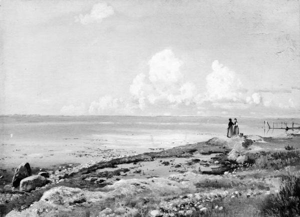 P.C. Skovgaard painted this view from the North Coast of Sealand towards Kullen in Sweden on a summer evening. In this artwork, trees stand as silent sentinels, framing the vast expanse of sea and sky, a symbol deeply rooted in the Romantic era's reverence for nature's sublime power. Consider the solitary tree, a motif that echoes through art history. In earlier times, a tree might represent the Tree of Life, a sacred symbol of growth, knowledge, and immortality. Here, the trees, with their gnarled branches reaching towards the heavens, speak to us of nature's enduring spirit, a theme that pervades northern Romanticism. The psychological weight of the image lies in its invitation to contemplation, to a merging with nature's tranquility. This yearning for harmony is not new; it is a recurrent echo of humanity's quest for solace and understanding in the face of the world's mysteries. The tree, the sea, the sky – these are the eternal symbols that continue to resonate in our collective consciousness, evolving in form, yet retaining their primal emotional power.