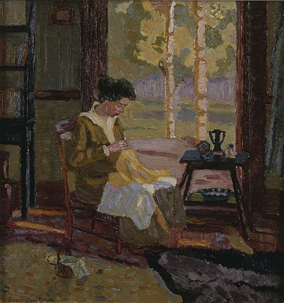 Poul S. Christiansen painted this image of a woman sewing in a gazebo in the late 19th or early 20th century. At the time, traditional gender roles assigned women to the domestic sphere, with sewing and needlework being common activities. The painting provides an intimate glimpse into the life of a woman during this period. Her attention is focused on the delicate task at hand, yet the open-air setting and the presence of writing materials on the table suggest a life that extends beyond the purely domestic. She is not confined by the space, but rather occupies it, bringing her creativity and intellect to bear on her surroundings. The gazebo is a transitional space, blurring the boundaries between public and private life. What does it mean to see this woman, not as trapped, but temporarily at rest?