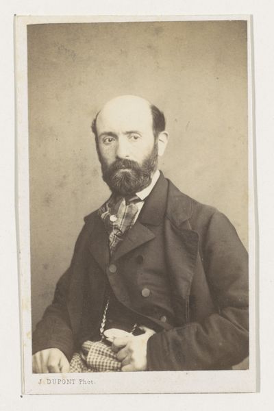 Editor: This is a portrait of Francois Adolphe Grison, an albumen print from the 1860s. I find the monochromatic tones quite captivating and evocative, almost romantic. What details jump out at you when you look at this piece? Curator: The first aspect I note is the formal composition, carefully arranging the subject within the carte-de-visite format. Consider how the subject's gaze directs our own, inviting us into a visual dialogue. Note, too, how the tonality enhances the textured surfaces. Observe how the sharp focus on the face and beard gradually softens towards the periphery of the jacket and hat. Editor: That’s an interesting observation about the textures. The focus does shift. It seems almost symbolic, doesn’t it? Like his thoughts are as sharp as his gaze, if that makes sense. Curator: Symbolism can be construed, yes. But is that an intentional use by the artist or an imposition on the image? Look at the shapes and contrasts within the portrait itself. The curve of the hat echoes the soft edges of the mount; do these visual rhythms create a sense of harmony? Or perhaps an underlying tension? Editor: I think they complement each other; I see a harmony. I’ve learned that photographic compositions, particularly in portraits like this one, involve much more than simply capturing a likeness. Thanks! Curator: Indeed, such nuanced photographic portraits provide rich opportunities to study pictorial techniques from a formal point of view, going beyond the immediate impression.