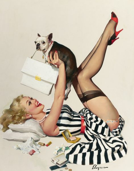 Editor: This is Gil Elvgren's "Bear Facts," painted in 1962 using oil paints. It has quite an… assertive quality. The woman, the black lingerie, and the fur rug featuring a bear’s head... What strikes you about this piece? Curator: The conspicuous display of materials speaks volumes. Consider the oil paint itself: a mass-produced, readily available medium facilitating this fantasy. The "fur" rug is perhaps the most telling. What does it mean to depict simulated luxury? Editor: I guess it points to the commodification of even wild spaces and animals. The 'natural' world rendered as a domestic prop. Curator: Precisely. Note, too, how the woman is constructed. She isn't simply represented; she's manufactured. Her hair, makeup, and clothing, all consumer goods meant to shape identity, hint at social performances and gender roles. The male gaze is material here, an industrial process! Editor: That's fascinating. So, it's not just about the surface image, but about how all these components work together. Curator: Exactly. Think about the labor involved in creating and then selling that image – from the oil paint's creation to the marketing that would use images like this. Editor: So analyzing Elvgren through a materialist lens really helps expose its connections to consumer culture. I didn’t think of it that way before. Curator: That’s the key—seeing beyond the image, recognizing the power of the object, the process, and the inherent economic relations at play.