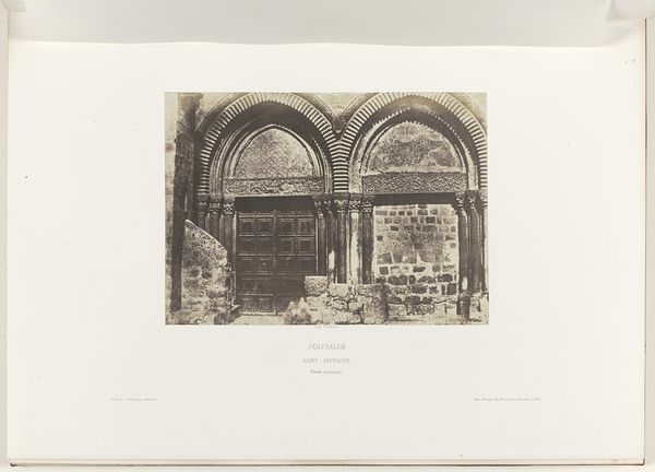 Curator: Let’s consider this albumen print, "Arch of the Church of Saint Mary of the Latins, Jerusalem," captured between 1854 and 1856 by Auguste Salzmann. Editor: My first impression is one of quiet grandeur, a study in contrasts. The starkness of the stone, combined with the arching form, creates an immediate sense of depth and monumentality. Curator: Salzmann was commissioned by Henri de Luynes, tasked with producing photographic evidence to support theories about the Temple Mount's original location. This wasn't purely an artistic endeavor; it had explicit political and scholarly intentions. Editor: Right, it speaks volumes about the materials used: the rough-hewn stones, their arrangement—all laboriously worked, reflecting the time and energy invested. There's an honest simplicity to it. This albumen process too, must have been meticulous. Curator: Exactly. The choice of albumen print, itself a laborious process, offered exceptional detail for the time, serving this aim to document archeological sites. His work later faced scrutiny, particularly regarding its objective truth, highlighting the complexities inherent in photography's supposed realism. Editor: I see the marks and weathering of time on those stones – it’s about layering meaning and historical impact through material presence, far beyond the surface appearance. This also prompts the viewers to imagine the working conditions. Curator: Beyond just documenting, it influenced Western perceptions of the region. The image circulated within intellectual circles, shaping historical narratives and contributing to the discourse on biblical archaeology. It underscores how photography plays a vital role in cultural imagination and knowledge production. Editor: Knowing all of this has given me new thoughts. Now, to see the craftsmanship combined with the historical narratives, really brings it alive. I’m not only contemplating history, I also want to question and examine these historical processes! Curator: Indeed. And understanding that duality enriches our experience, emphasizing how an image of a static subject like an arch can reverberate through cultural history.